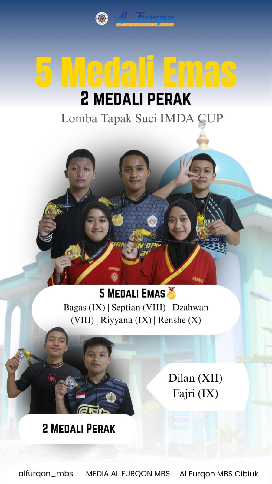 Al-Furqon MBS Cibiuk Garut kembali menorehkan prestasi membanggakan di tingkat kompetisi pelajar. Dalam ajang Lomba Tapak Suci IMDA CUP II, para santri berhasil menunjukkan kedisiplinan, ketangguhan mental, dan kemampuan bela diri yang luar biasa dengan meraih 5 medali emas dan 2 medali perak.